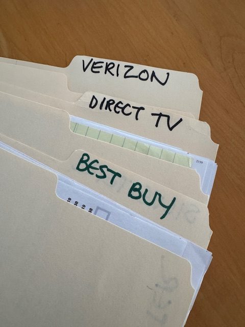 I do want to make sure I have the last year’s history of bills, so they will go in my SCAN AND SHRED box. A quick aside here is the first three folders I pulled out of a file drawer are three vendors we haven’t used in YEARS. I have a high-speed scanner at my office, so that will help get me out of the hole (Verizon, DirectTV and Best Buy folders right to the fire pit), but going forward a simple printer/scanner will help me with the day-to-day. Where do I scan them to? I use Google Drive, but if anyone’s got a suggestion for something more local like how they save to an external hard drive, I could be convinced to not store them out there on the internet.