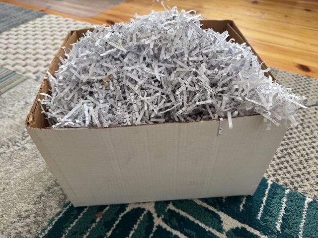 With three dogs, we’re constantly getting Chewy shipments, and have small cardboard boxes, exactly the size of printer paper, so that’s what I’m using to sort and dig myself out of the backlog. If you have access to office supplies, a basic set of in/out boxes can do the same. If you have a recycle center near you, you might find some there. There’s a whole office supply section at the recycle center I visit in West Boylston.