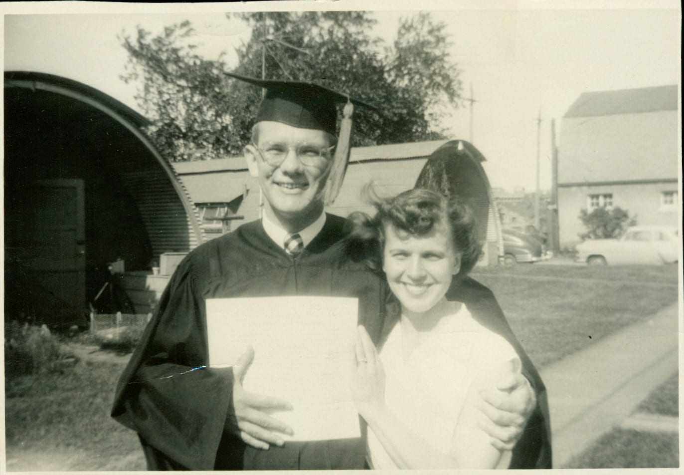 My in-laws Jay and Shirley Shenk at my father-in-law’s graduation from Yale Divinity School, June 11, 1956…taken in front of the quonset hut that they lived in with 2 kids. What is a quonset hut? Jay always explains it to the kids as living in a tin can…”The Quonset Hut is an easily recognizable architectural form”