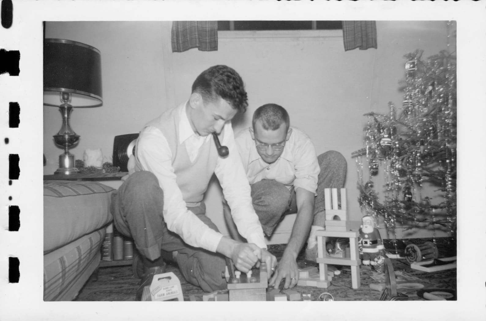 Jay’s father Jay Shenk and his pipe-smoking friend assembling toys on Christmas (1954-ish)