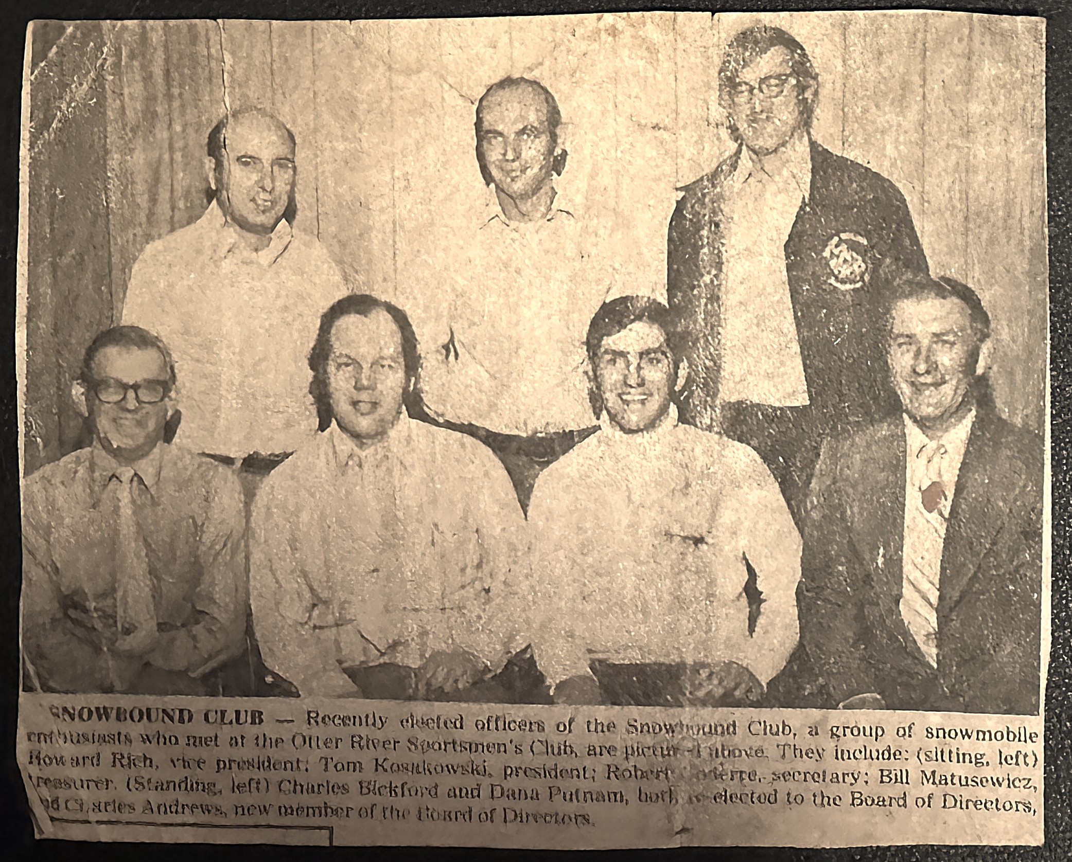 CAPTION (edited to include my family reference): Recently elected officers of the Snowbound Club, a group of snowmobile enthusiasts, who met at the Otter River Sportsmen’s Club, are pictured above. They include: (sitting, left) Howard Rich (“Grandpa Rich”–but if we were related, it was very distantly), vice president: Tom Kosakowski (my Uncle Tom, married to my Aunt Edie who is my father’s sister), president; Robert Goderre, secretary; Bill Matusewicz, treasurer. (Standing, left) Charles Bickford and Dana Putnam, both re-elected to the Board of Directors, and Charles Andrews (my father), new member of the Board of Directors.