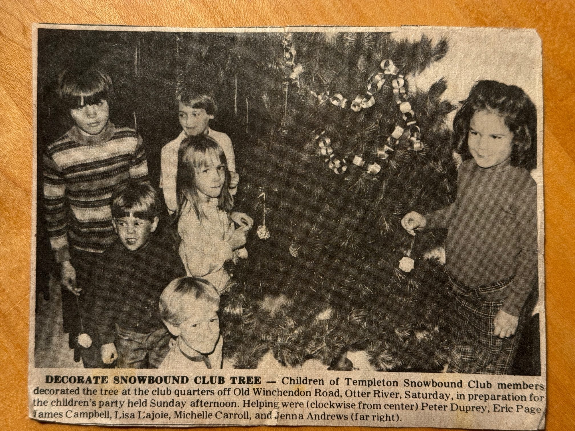 CAPTION: Children of the Templeton Snowbound Club members decorated the tree at the club quarters off Old Winchendon Road, Otter River, Saturday, in preparation for the children’s party held Sunday afternoon. Helping were (clockwise from center) Peter Duprey, Eric Page, James Campbell, Lisa Lajoie, Michelle Carroll and Jenna Andrews (far right)–that’s me, but don’t ever call me Jenna.