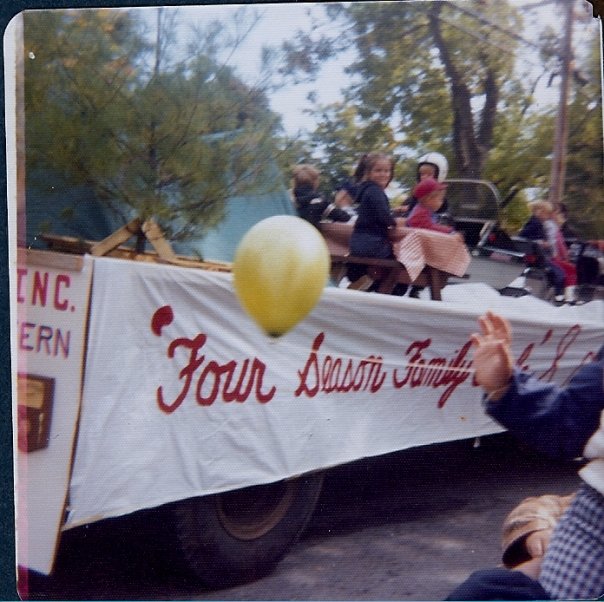 In 1976 there was a big parade to celebrate the Bicentennial–the 200th anniversary of the signing of the Declaration of Independence. I think this ‘big parade’ went all the way from Baldwinville to Templeton. That called for some resourceful people to secure a huge flatbed and put their kids up on there–my brother Jay and I sitting at a picnic table on a moving homemade float and some others in the cat cutter with snowmobile hats on in July–we had a blast waving at the crowd and throwing candy.